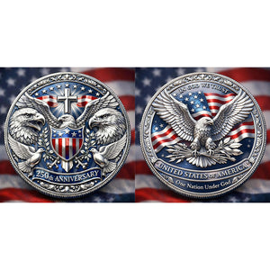 The front side features a powerful composition centered on two majestic bald eagles facing outward, symbolizing vigilance, strength, and national sovereignty. At the center lies a classic American shield with stars and stripes, representing unity and protection. Above the shield stands a raised cross, radiating light and symbolizing faith, guidance, and moral foundation. Olive branches and doves appear at the lower section, conveying peace and hope. The inscription “250th Anniversary” at the bottom commemorates this historic milestone.