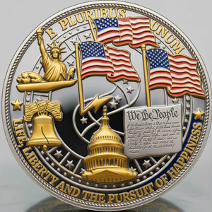 Back Design: This side depicts iconic symbols of American democracy and freedom: the Liberty Bell, the Capitol Building, and the Declaration of Independence. It beautifully encapsulates the values of life, liberty, and the pursuit of happiness as outlined in the U.S. Constitution. 📜⚖️