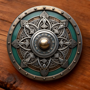 The shield side draws inspiration from medieval knight armor, featuring intricate knotwork radiating from a raised central boss.