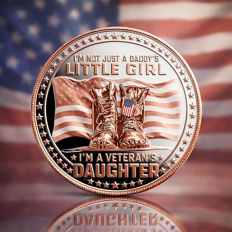 The reverse displays military boots set against a waving American flag, symbolizing patriotism and legacy. The inscriptions “I’M NOT JUST A DADDY’S LITTLE GIRL” and “I’M A VETERAN’S DAUGHTER” honor the bond between a veteran and their daughter, expressing pride, respect, and the continuation of military values across generations.