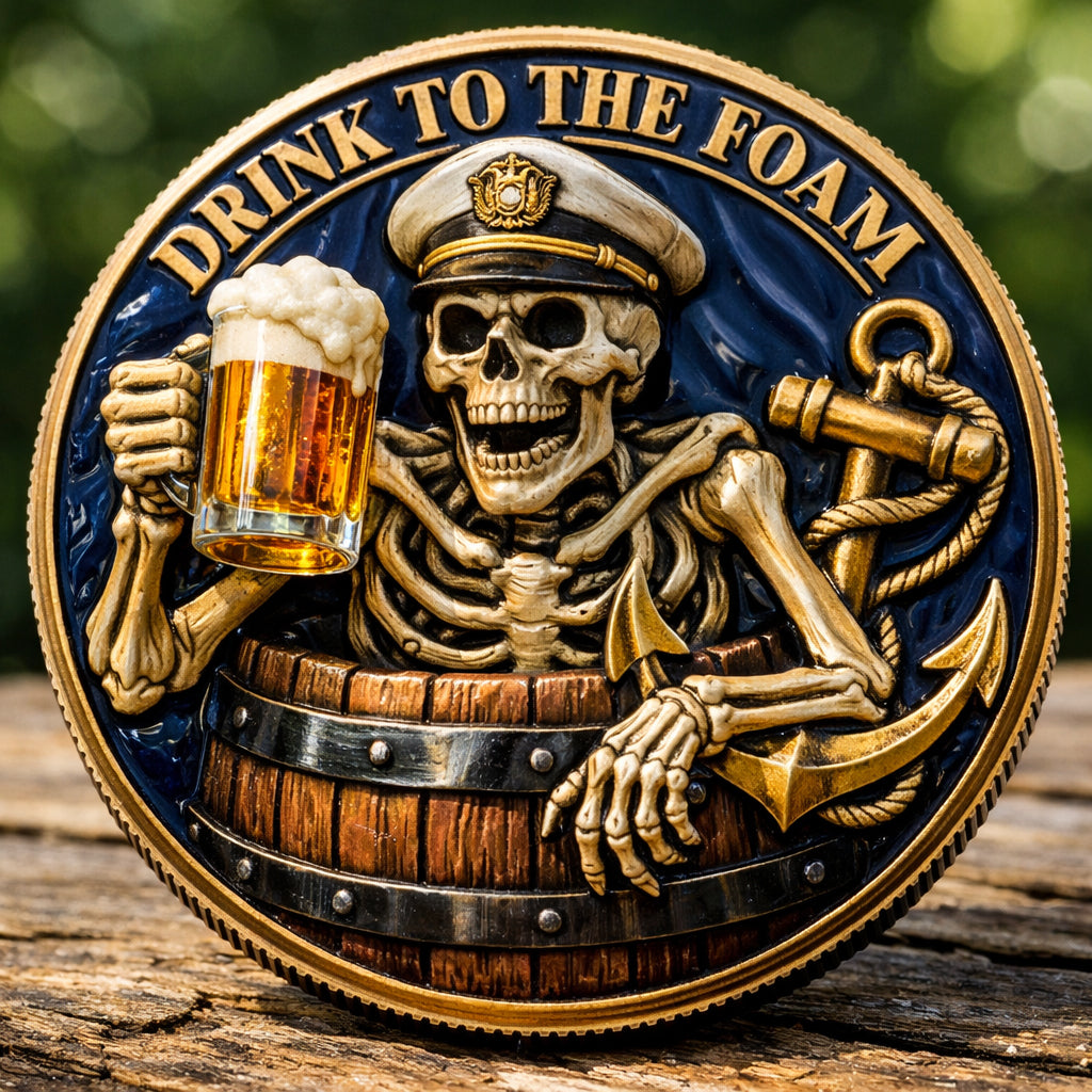 The obverse features a striking nautical skeleton captain emerging from a wooden barrel, raising a frothing mug of beer in celebration. Wearing a sailorās cap and gripping a classic anchor, the figure embodies maritime grit, dark humor, and the timeless spirit of sailors who face the sea with courage and cheer.