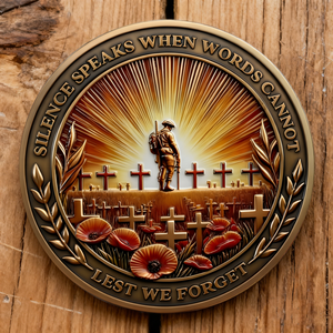 The reverse depicts a lone soldier standing amidst a field of crosses and poppies, bathed in golden light. With inscriptions “SILENCE SPEAKS WHEN WORDS CANNOT” and “LEST WE FORGET”, it encapsulates respect for heroes whose stories live on through memory. Every element, from the soldier’s uniform to poppy petals, is rendered in 3D relief, making the scene hauntingly vivid.