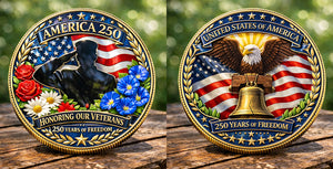 This commemorative coin honors the United States on its 250th anniversaryācelebrating the nationās founding, the freedoms it has preserved, and the veterans whose service made those freedoms possible.